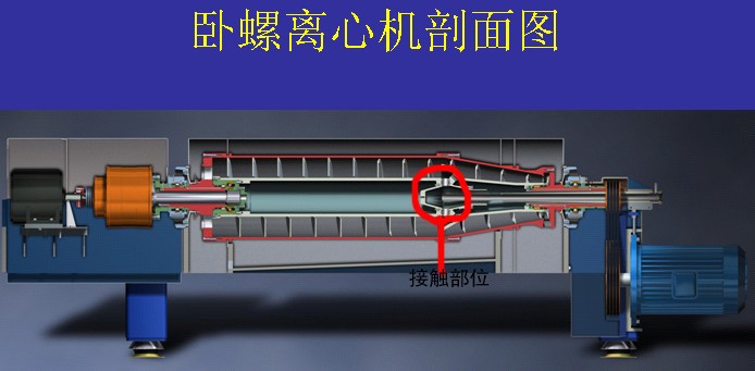 綜述:以上第4點是解決離心機運行時的靜態(tài)耐磨措施,由于泥漿等硬質(zhì)廢水剛進離心機有一定的沖擊磨損及動態(tài)磨損,從離心機剖面圖上可以看到,廢水是經(jīng)進料管直接通到離心機紅圈部位(如圖1),此部位我們設(shè)計了凹槽結(jié)構(gòu),就是為了減少泥漿對初接面的沖擊力,經(jīng)此回流的低速廢水就可以安全處理了。在初接面的區(qū)域設(shè)計實心(如圖2),即便有沖擊磨損,實心區(qū)的材質(zhì)也足夠5年以上的磨損,離心機也得到最大限度的保護。