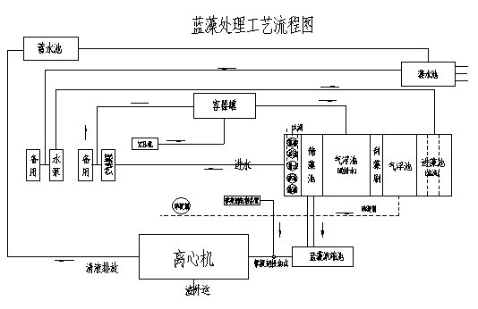 藍(lán)藻由水泵從湖面抽至進(jìn)藻池內(nèi),藻泥由進(jìn)藻池溢流到氣浮池,在氣浮池內(nèi)由空壓機(jī)泵入氣、水對(duì)氣浮池內(nèi)的藻泥進(jìn)行攪動(dòng)的同時(shí),另一條管線泵入助凝劑進(jìn)行助凝,經(jīng)過(guò)助凝和氣浮后的藻泥,由于比重較輕因此浮在池面上,這時(shí)通過(guò)刮藻刷把氣浮池表面堆積的藻泥刮到儲(chǔ)藻池,儲(chǔ)藻池內(nèi)上層藻泥溢流至藍(lán)藻濃縮池,下部水通過(guò)管路排出進(jìn)入容器罐,在藍(lán)藻濃縮池經(jīng)過(guò)濃縮后的藻泥通過(guò)與絮凝劑投加裝置輸送過(guò)來(lái)的絮凝劑進(jìn)行絮凝后進(jìn)入離心機(jī)進(jìn)行分離后,分離后的渣相外運(yùn),液相排入湖面。